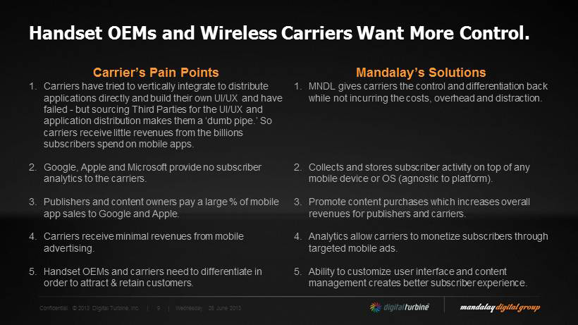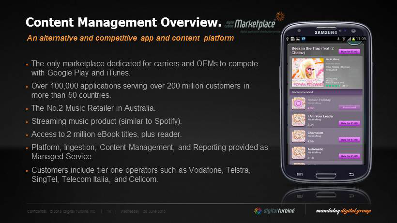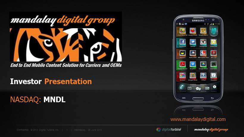 Confidential. © 2013 Digital Turbine, Inc. | | Wednesday, 26 June 2013 1 End to End Mobile Content Solution for Carriers and OEMs Investor Presentation NASDAQ: MNDL www.mandalaydigital.com