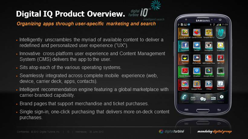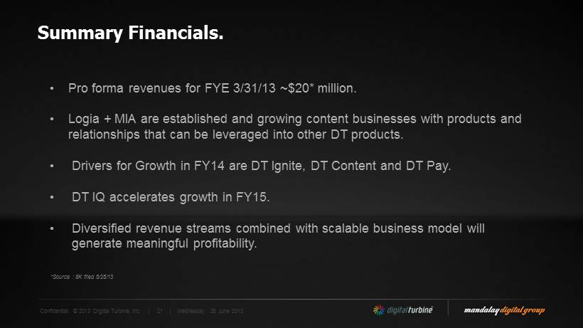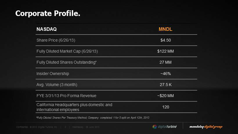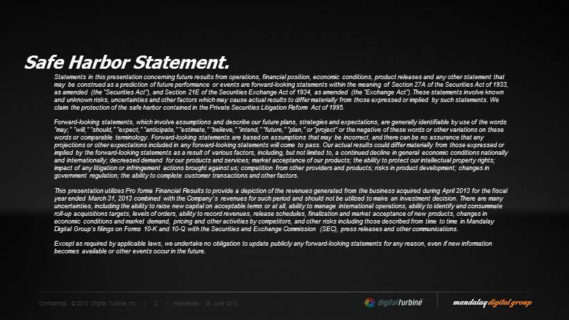 Confidential. © 2013 Digital Turbine, Inc. | | Wednesday, 26 June 2013 2 Safe Harbor Statement. Statements in this presentation concerning future results from operations, financial position, economic conditions, product r ele ases and any other statement that may be construed as a prediction of future performance or events are forward - looking statements within the meaning of Section 27 A of the Securities Act of 1933, as amended (the “Securities Act”), and Section 21E of the Securities Exchange Act of 1934, as amended (the “Exchange Act”) . These statements involve known and unknown risks, uncertainties and other factors which may cause actual results to differ materially from those expressed o r i mplied by such statements. We claim the protection of the safe harbor contained in the Private Securities Litigation Reform Act of 1995. Forward - looking statements, which involve assumptions and describe our future plans, strategies and expectations, are generally identifiable by use of the words “may,” “will,” “should,” “expect,” “anticipate,” “estimate,” “believe,” “intend,” “future,” “plan,” or “project” or the negat ive of these words or other variations on these words or comparable terminology. Forward - looking statements are based on assumptions that may be incorrect, and there can be no assurance that any projections or other expectations included in any forward - looking statements will come to pass. Our actual results could differ materially from those expressed or implied by the forward - looking statements as a result of various factors, including, but not limited to, a continued decline in general economic conditions nationally and internationally; decreased demand for our products and services; market acceptance of our products; the ability to protec t o ur intellectual property rights; impact of any litigation or infringement actions brought against us; competition from other providers and products; risks in pro duct development; changes in government regulation; the ability to complete customer transactions and other factors. This presentation utilizes Pro forma Financial Results to provide a depiction of the revenues generated from the business acquired during April 2013 for the fiscal year ended March 31, 2013 combined with the Company’s revenues for such period and should not be utilized to make an investme nt decision. There are many uncertainties, including the ability to raise new capital on acceptable terms or at all, ability to manage international oper ati ons, ability to identify and consummate roll - up acquisitions targets, levels of orders, ability to record revenues, release schedules, finalization and market acceptanc e of new products, changes in economic conditions and market demand, pricing and other activities by competitors, and other risks including those described fr om time to time in Mandalay Digital Group's filings on Forms 10 - K and 10 - Q with the Securities and Exchange Commission (SEC), press releases and other commu nications. Except as required by applicable laws, we undertake no obligation to update publicly any forward - looking statements for any reas on, even if new information becomes available or other events occur in the future .