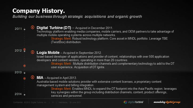 Confidential. © 2013 Digital Turbine, Inc. | | Wednesday, 26 June 2013 5 ; Digital Turbine ( DT ) – Acquired in December 2011. Technology platform enabling media companies, mobile carriers, and OEM partners to take advantage of multiple mobile operating systems across multiple networks . Strategic Merit: Robust technology platform. Core asset in MNDL portfolio. Leverage TBE ( TwistBox ) distribution. ; Logia Mobile – Acquired in September 2012. Israel - based developer of applications and provider of content; relationships with over 500 application developers and content vendors , operating in more than 20 countries . Strategic Merit: Multiple distribution channels and complementary technology to add to the DT user experience. Acquisition of DT Ignite. ; MIA – Acquired in April 2013. Australia - based mobile solutions provider with extensive content licenses , a proprietary content management system and billing integration. Strategic Merit: Enables MNDL to expand the DT footprint into the Asia Paci;c region; leverages key synergies within the group including distribution channels, content , product offerings, services and personnel. Company History. Building our business through strategic acquisitions and organic growth