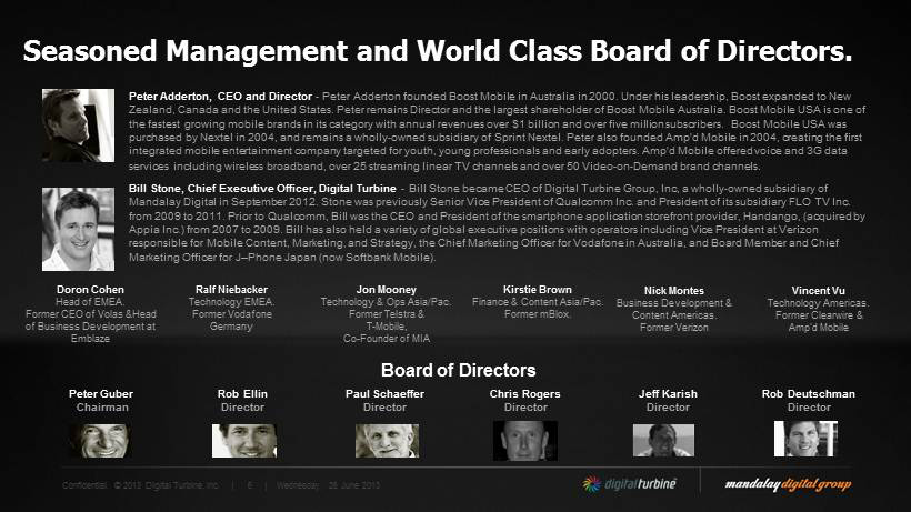 Confidential. © 2013 Digital Turbine, Inc. | | Wednesday, 26 June 2013 6 Seasoned Management and World Class Board of Directors. Peter Adderton , CEO and Director - Peter Adderton founded Boost Mobile in Australia in 2000. Under his leadership, Boost expanded to New Zealand, Canada and the United States. Peter remains Director and the largest shareholder of Boost Mobile Australia. Boost Mo bil e USA is one of the fastest growing mobile brands in its category with annual revenues over $1 billion and over five million subscribers. Bo ost Mobile USA was purchased by Nextel in 2004, and remains a wholly - owned subsidiary of Sprint Nextel. Peter also founded Amp'd Mobile in 2004, creating the first integrated mobile entertainment company targeted for youth, young professionals and early adopters. Amp'd Mobile offered voice and 3G data services including wireless broadband, over 25 streaming linear TV channels and over 50 Video - on - Demand brand channels . Bill Stone, Chief Executive Officer, Digital Turbine - Bill Stone became CEO of Digital Turbine Group, Inc , a wholly - owned subsidiary of Mandalay Digital in September 2012. Stone was previously Senior Vice President of Qualcomm Inc. and President of its subsidiary FLO TV Inc. from 2009 to 2011. Prior to Qualcomm, Bill was the CEO and President of the smartphone application storefront provider, Handango , (acquired by Appia Inc.) from 2007 to 2009. Bill has also held a variety of global executive positions with operators including Vice President a t Verizon responsible for Mobile Content, Marketing, and Strategy, the Chief Marketing Officer for Vodafone in Australia, and Board Mem ber and Chief Marketing Officer for J – Phone Japan (now Softbank Mobile). Doron Cohen Head of EMEA. Former CEO of Volas &Head of Business Development at Emblaze Ralf Niebacker Technology EMEA. Former Vodafone Germany Jon Mooney Technology & Ops Asia/Pac. Former Telstra & T - Mobile, Co - Founder of MIA Kirstie Brown Finance & Content Asia/Pac . Former mBlox . Nick Montes Business Development & Content Americas. Former Verizon Vincent Vu Technology Americas. Former Clearwire & Amp'd Mobile Board of Directors Peter Guber Chairman Rob Ellin Director Paul Schaeffer Director Chris Rogers Director Jeff Karish Director Rob Deutschman Director