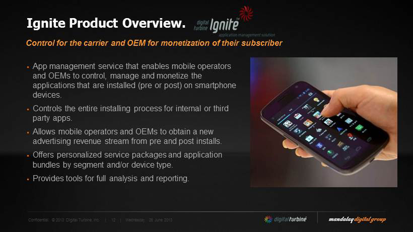 Confidential. © 2013 Digital Turbine, Inc. | | Wednesday, 26 June 2013 11 An End - to - end Mobile Content Solution.