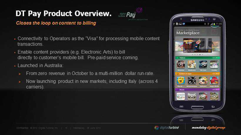 Confidential. © 2013 Digital Turbine, Inc. | | Wednesday, 26 June 2013 15 DT Pay Product Overview. ▪ Connectivity to Operators as the “Visa” for processing mobile content transactions. ▪ Enable content providers (e.g. Electronic Arts) to bill directly to customer’s mobile bill. Pre - paid service coming. ▪ Launched in Australia: » From zero revenue in October to a multi - million dollar run - rate. » Now launching product in new markets, including Italy (across 4 carriers). Closes the loop on content to billing