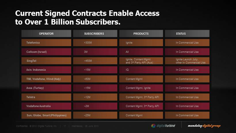 Confidential. © 2013 Digital Turbine, Inc. | | Wednesday, 26 June 2013 17 OPERATOR SUBSCRIBERS PRODUCTS STATUS Telefonica >300M Ignite In Commercial Use Cellcom (Israel) 3M All In Commercial Use SingTel ~450M Ignite, Content Mgmt and 3 rd Party API (Aus) Ignite Launch July, other In Commercial Use Axis Indonesia ~15M IQ In Commercial Use TIM , Vodafone, Wind (Italy) ~60M Content Mgmt In Commercial Use Avea (Turkey) ~15M Content Mgmt , Ignite In Commercial Use Telstra ~12M Content Mgmt , 3 rd Party API In Commercial Use Vodafone Australia ~2M Content Mgmt , 3 rd Party API In Commercial Use Sun, Globe, Smart (Philippines) ~ 25M Content Mgmt In Commercial Use Current Signed Contracts Enable Access to Over 1 Billion Subscribers.