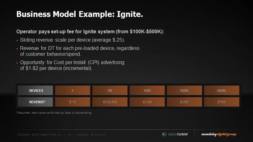Confidential. © 2013 Digital Turbine, Inc. | | Wednesday, 26 June 2013 20 Business Model Example: Ignite. Operator pays set - up fee for Ignite system (from $ 100K - $ 500K ): ▪ Sliding revenue scale per device (average $.25). ▪ Revenue for DT for each pre - loaded device, regardless of customer behavior/spend. ▪ Opportunity for Cost per Install (CPI) advertising of $1 - $2 per device (incremental). *Assumes zero revenue for set - up fees or advertising. DEVICES 1 1M 10M 100M 500M REVENUE* $. 15 $150,000 $1.5M $15M $75M