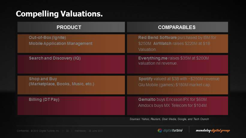 Confidential. © 2013 Digital Turbine, Inc. | | Wednesday, 26 June 2013 22 PRODUCT COMPARABLES Out - of - Box (Ignite) Mobile Application Management Red Bend Software purchased by IBM for $250M AirWatch raises $220M at $1B Valuation. Search and Discovery (IQ) Everything.me raises $35M at $200M valuation nil revenue. Shop and Buy (Marketplace, Books, Music, etc.) Spotify valued at $3B with ~$250M revenue Glu Mobile (games) $180M market cap. Billing (DT Pay) Gemalto buys Ericsson IPX for $60M. Amdocs buys MX Telecom for $104M. Compelling Valuations. Sources: Yahoo, Reuters, Doat Media, Google, and Tech Crunch