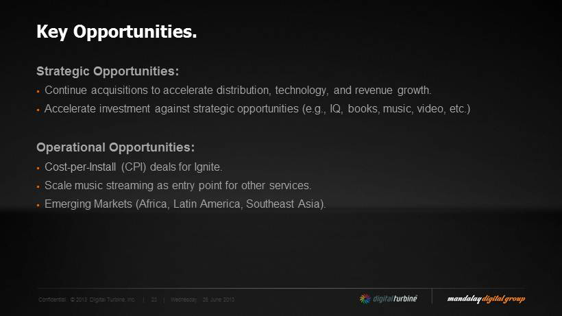 Confidential. © 2013 Digital Turbine, Inc. | | Wednesday, 26 June 2013 23 Key Opportunities. Strategic Opportunities: ▪ Continue acquisitions to accelerate distribution, technology, and revenue growth. ▪ Accelerate investment against strategic opportunities (e.g., IQ, books, music, video, etc.) Operational Opportunities: ▪ Cost - per - Install (CPI) deals for Ignite. ▪ Scale music streaming as entry point for other services. ▪ Emerging Markets (Africa, Latin America, Southeast Asia).