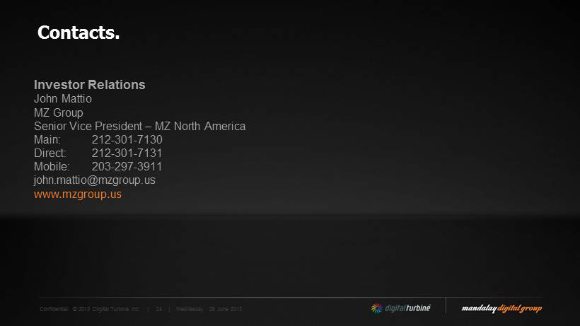 Confidential. © 2013 Digital Turbine, Inc. | | Wednesday, 26 June 2013 24 Contacts. Investor Relations John Mattio MZ Group Senior Vice President – MZ North America Main: 212 - 301 - 7130 Direct: 212 - 301 - 7131 Mobile: 203 - 297 - 3911 john.mattio@mzgroup.us www.mzgroup.us