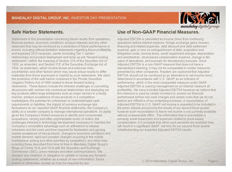 the potential for unforeseen or underestimated cash requirements or liabilities, the impact of currency exchange rate fluctuations on our reported GAAP financial statements, the Company’s ability as a smaller company to manage international operations, its ability given the Company’s limited resources to identify and consummate acquisitions, varying and often unpredictable levels of orders, the challenges inherent in technology development necessary to maintain the Company’s competitive advantage such as adherence to release schedules and the costs and time required for finalization and gaining market acceptance of new products, changes in economic conditions and market demand, rapid and complex changes occurring in the mobile marketplace, pricing and other activities by competitors, and other risks including those described from time to time in Mandalay Digital Group's filings on Forms 10 - K and 10 - Q with the Securities and Exchange Commission (SEC), press releases and other communications. We disclaim any intention or obligation to update or revise any forward - looking statements, whether as a result of new information, future events or otherwise, except as may be required by law. Use of Non - GAAP Financial Measures. Adjusted EBITDA is calculated as income (loss) from continuing operations before interest expense, foreign exchange gains (losses), financing and related expenses, debt discount and debt settlement expense, gain or loss on extinguishment of debt, acquisition and integration costs, income taxes, asset impairment charges, depreciation and amortization, stock - based compensation expense, change in fair value of derivatives, and accruals for discretionary bonuses. Since Adjusted EBITDA is a non - GAAP measure that does not have a standardized meaning, it may not be comparable to similar measures presented by other companies. Readers are cautioned that Adjusted EBITDA should not be construed as an alternative to net income (loss) determined in accordance with U.S. GAAP as an indicator of performance, which is the most comparable measure under GAAP. Adjusted EBITDA is used by management as an internal measure of profitability. We have included Adjusted EBITDA because we believe that this measure is used by certain investors to assess our financial performance before non - cash charges and certain costs that we do not believe are reflective of our underlying business. A reconciliation of Adjusted EBITDA to U.S. GAAP net income is expected to be included in the press release announcing the results of our second fiscal quarter, however such reconciliation to future net income is not currently available without unreasonable effort. The information that is unavailable is primarily asset impairment and expenses related to stock - based compensation; it is probable that when such amounts are available they will result in a significant GAAP net loss for our second fiscal quarter notwithstanding our expected Adjusted EBITDA results. MANDALAY DIGITAL GROUP, INC. INVESTOR DAY PRESENTATION © 2014 Mandalay Digital Group, Inc. Page 2