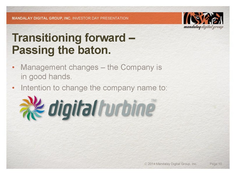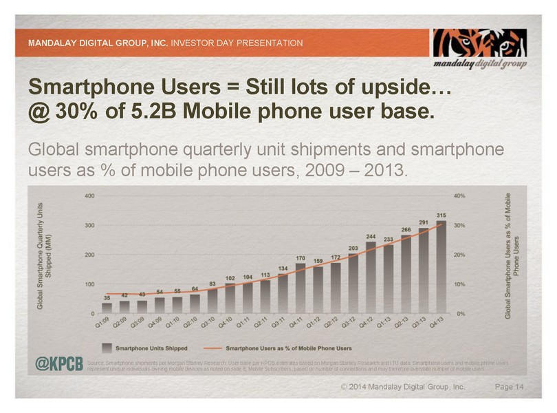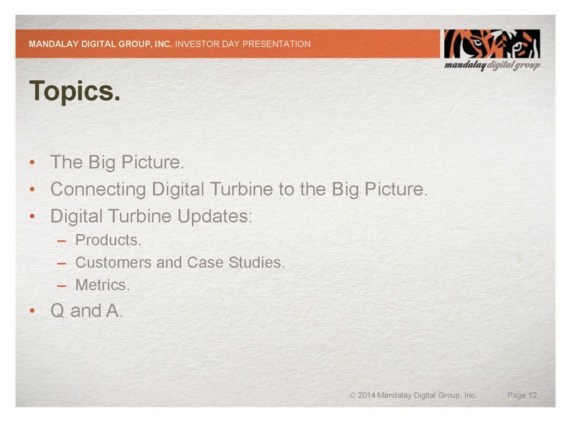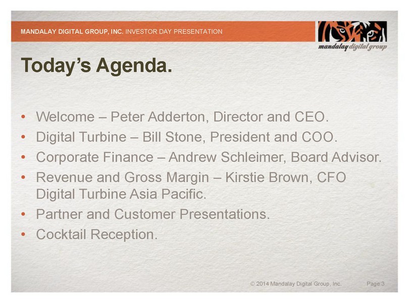 Today’s Agenda. • Welcome – Peter Adderton, Director and CEO. • Digital Turbine – Bill Stone, President and COO. • Corporate Finance – Andrew Schleimer, Board Advisor. • Revenue and Gross Margin – Kirstie Brown, CFO Digital Turbine Asia Pacific. • Partner and Customer Presentations. • Cocktail Reception. MANDALAY DIGITAL GROUP, INC. INVESTOR DAY PRESENTATION © 2014 Mandalay Digital Group, Inc.