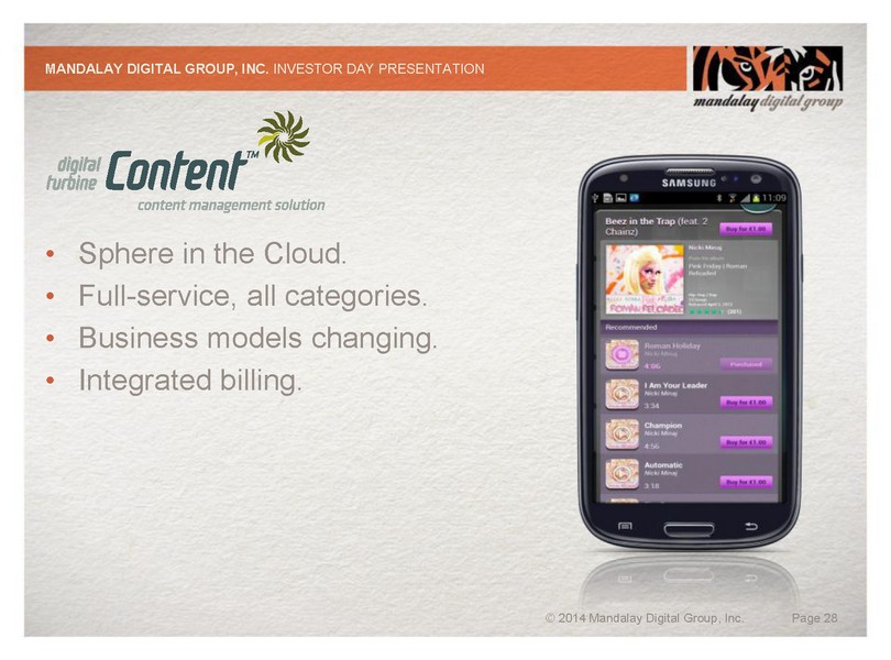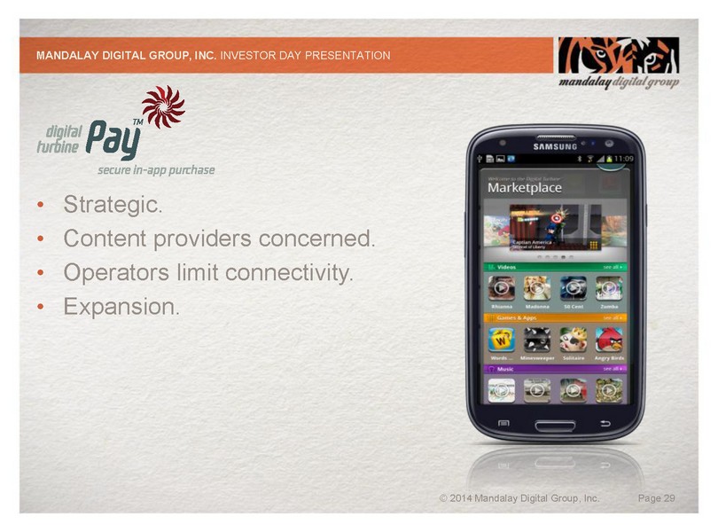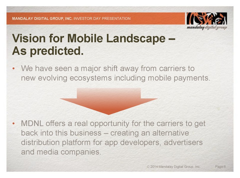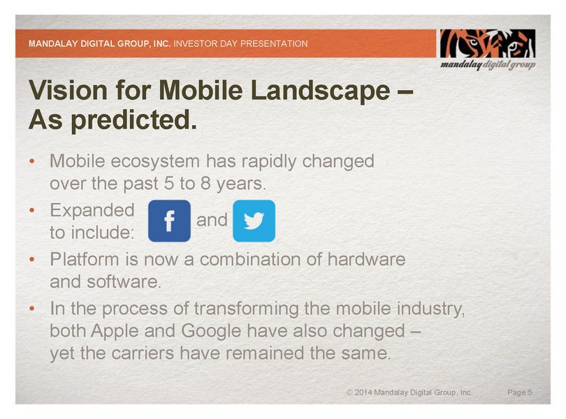 ision for Mobile Landscape – As predicted. • Mobile ecosystem has rapidly changed over the past 5 to 8 years. • Expanded to include: • Platform is now a combination of hardware and software. • In the process of transforming the mobile industry, both Apple and Google have also changed – yet the carriers have remained the same. MANDALAY DIGITAL GROUP, INC. INVESTOR DAY PRESENTATION © 2014 Mandalay Digital Group, Inc. Page 5 and
