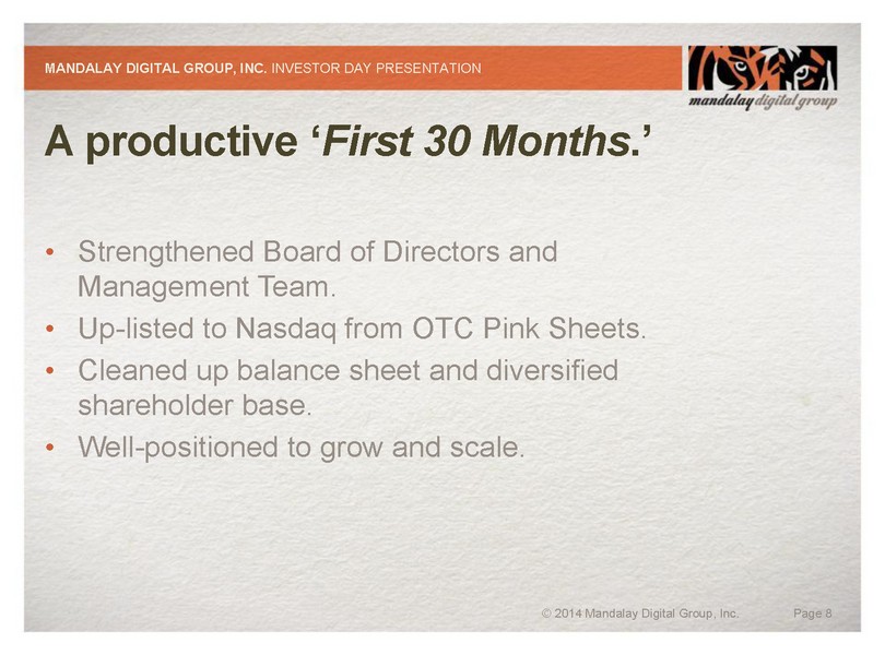 productive ‘ First 30 Months .’ • Contributed Digital Turbine for 100% equity into Mandalay Digital Group. • Combination of Technology (Adderton) with Content ( Guber) – a marriage of strengths. • Completed multiple acquisitions to build pipe to distribute products and services. MANDALAY DIGITAL GROUP, INC. INVESTOR DAY PRESENTATION © 2014 Mandalay Digital Group, Inc. Page 7