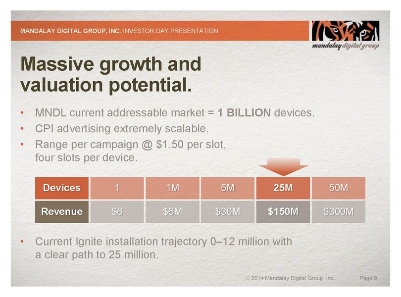 Massive growth and valuation potential. • MNDL current addressable market = 1 BILLION devices. • CPI advertising extremely scalable. • Range per campaign @ $1.50 per slot, four slots per device. • Current Ignite installation trajectory 0 – 12 million with a clear path to 25 million. MANDALAY DIGITAL GROUP, INC. INVESTOR DAY PRESENTATION © 2014 Mandalay Digital Group, Inc. Page 9 Devices 1 1M