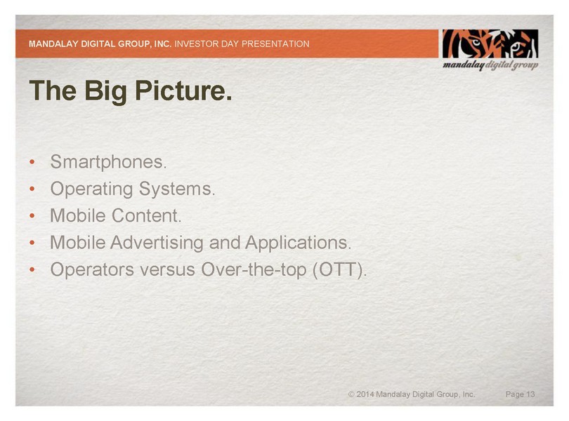 The Big Picture. • Smartphones. • Operating Systems. • Mobile Content. • Mobile Advertising and Applications. • Operators versus Over - the - top (OTT ). MANDALAY DIGITAL GROUP, INC. INVESTOR DAY PRESENTATION © 2014 Mandalay Digital Group, Inc. Page 13
