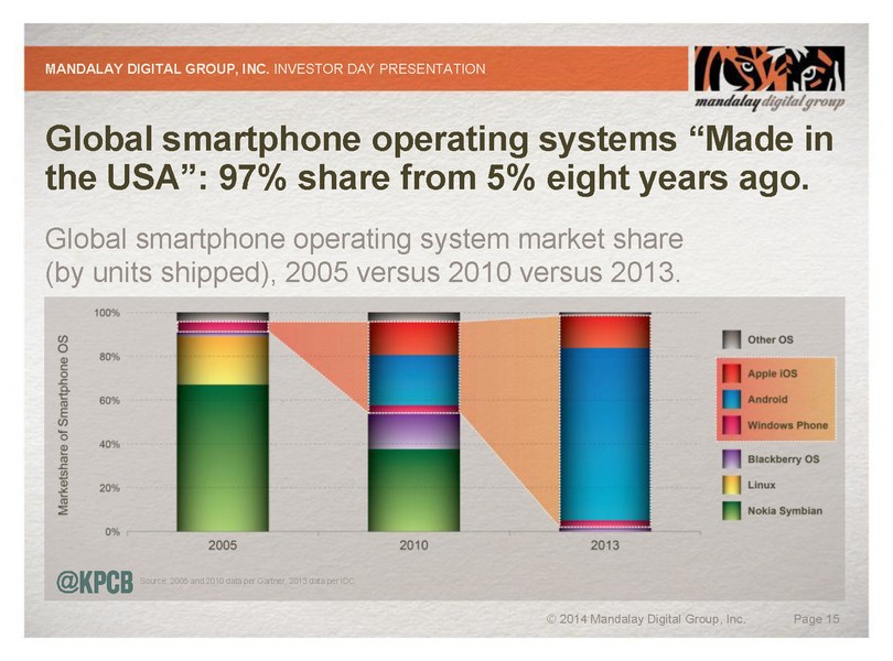 Smartphone Users = Still lots of upside… @ 30% of 5.2B Mobile phone user base. Global smartphone quarterly unit shipments and smartphone users as % of mobile phone users, 2009 – 2013. MANDALAY DIGITAL GROUP, INC. INVESTOR DAY PRESENTATION © 2014 Mandalay Digital Group, Inc. Page 14 Source: Smartphone shipments per Morgan Stanley Research. User base per KPCB estimates based on Morgan Stanley Research and I TU data. Smartphone users and mobile phone users represent unique individuals owning mobile devices as noted on slide 8; Mobile Subscribers, based on number of connections an d m ay therefore overstate number of mobile users.