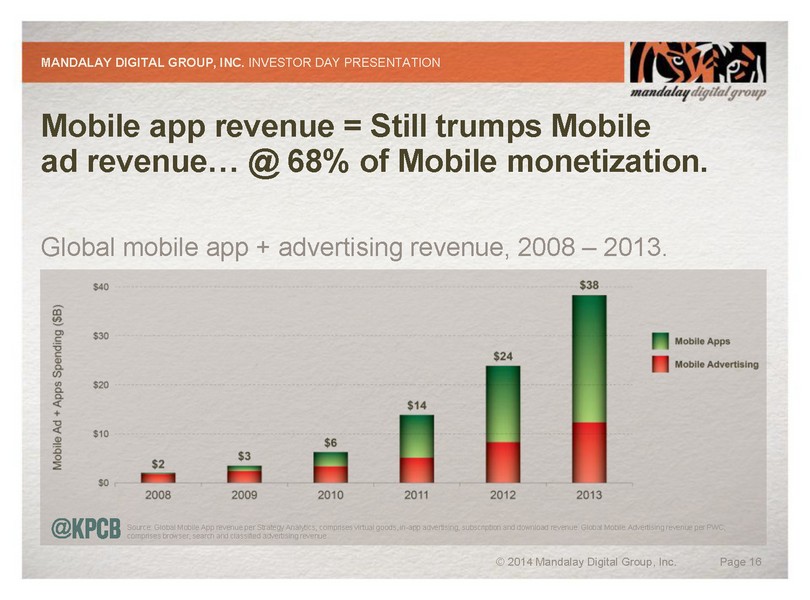 Mobile app revenue = Still trumps Mobile ad revenue… @ 68% of Mobile monetization. Global mobile app + advertising revenue, 2008 – 2013. MANDALAY DIGITAL GROUP, INC. INVESTOR DAY PRESENTATION © 2014 Mandalay Digital Group, Inc. Page 16 Source: Global Mobile App revenue per Strategy Analytics; comprises virtual goods, in - app advertising, subscription and download revenue. Global Mobile A dvertising revenue per PWC; comprises browser, search and classified advertising revenue.