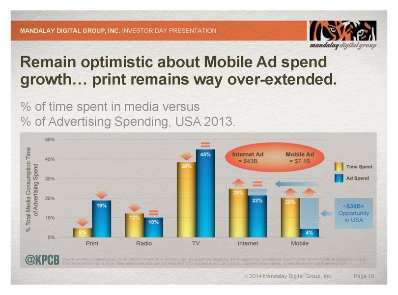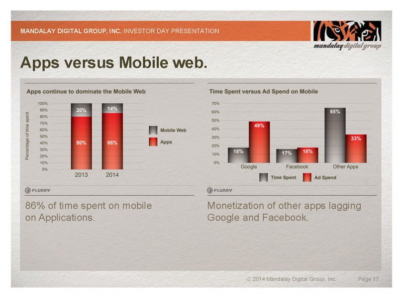 Apps versus Mobile web. MANDALAY DIGITAL GROUP, INC. INVESTOR DAY PRESENTATION © 2014 Mandalay Digital Group, Inc. Page 17 86% of time spent on mobile on Applications. Monetization of other apps lagging Google and Facebook.