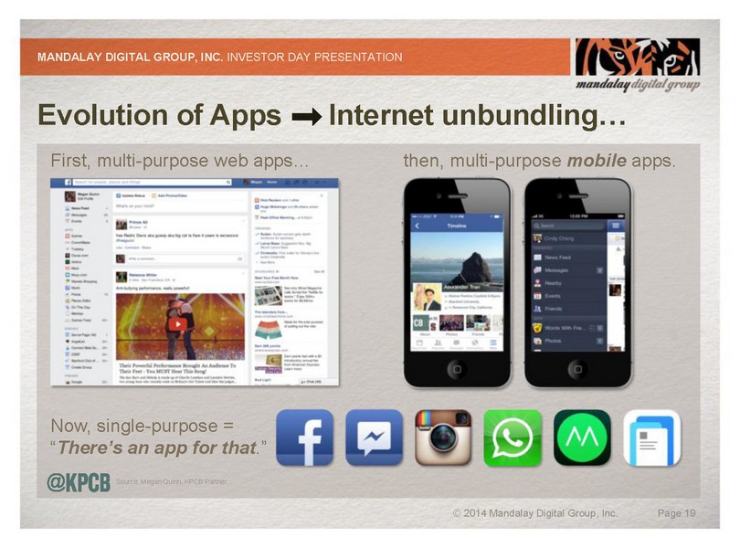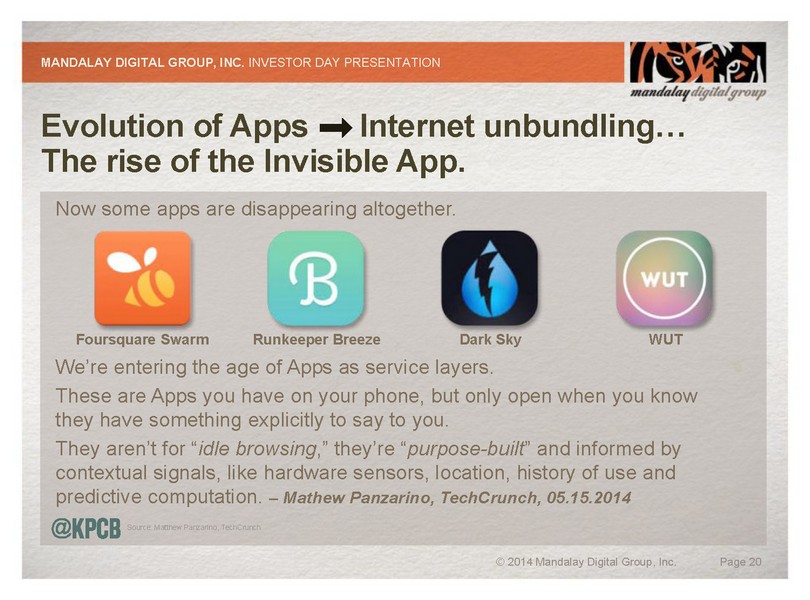 Evolution of Apps Internet unbundling… First, multi - purpose web apps… MANDALAY DIGITAL GROUP, INC. INVESTOR DAY PRESENTATION © 2014 Mandalay Digital Group, Inc. Page 19 Source: Megan Quinn, KPCB Partner. then, multi - purpose mobile apps. Now, single - purpose = “ There’s an app for that .”