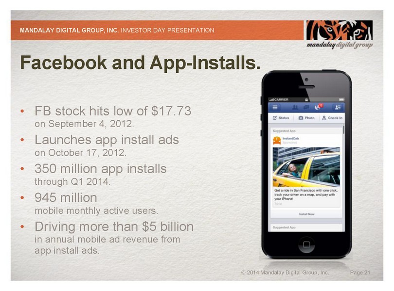 Facebook and App - Installs. • FB stock hits low of $17.73 on September 4, 2012. • Launches app install ads on October 17, 2012. • 350 million app installs through Q1 2014. • 945 million mobile monthly active users. • Driving more than $5 billion in annual mobile ad revenue from app install ads. MANDALAY DIGITAL GROUP, INC. INVESTOR DAY PRESENTATION © 2014 Mandalay Digital Group, Inc. Page 21