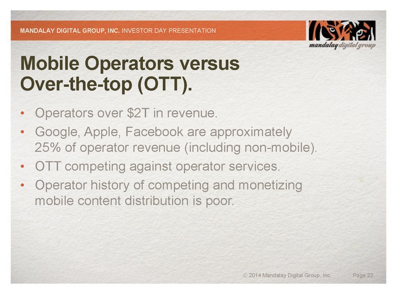 obile Operators versus Over - the - top (OTT ). • Operators over $2T in revenue. • Google, Apple, Facebook are approximately 25 % of operator revenue (including non - mobile ). • OTT competing against operator services. • Operator history of competing and monetizing mobile content distribution is poor. MANDALAY DIGITAL GROUP, INC. INVESTOR DAY PRESENTATION © 2014 Mandalay Digital Group, Inc. Page 22