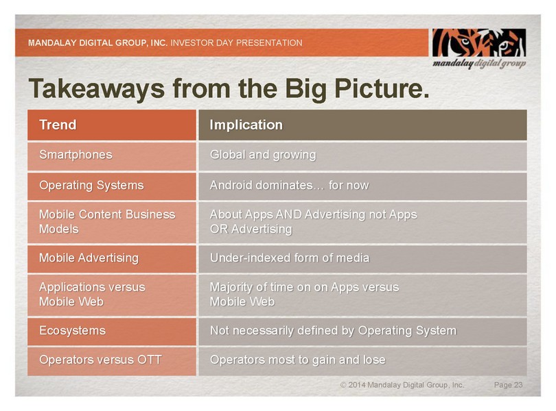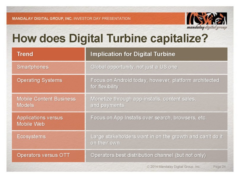 Takeaways from the Big Picture. MANDALAY DIGITAL GROUP, INC. INVESTOR DAY PRESENTATION © 2014 Mandalay Digital Group, Inc. Page 23 Trend Implication Smartphones Global and g rowing Operating Systems Android dominates … for now Mobile Content Business Models About Apps AND Advertising not Apps OR Advertising Mobile Advertising Under - indexed form of media Applications versus Mobile Web Majority of time on on Apps versus Mobile Web Ecosystems Not necessarily defined by Operating System Operators versus OTT Operators most to gain and lose
