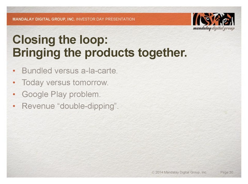 Closing the loop: Bringing the products together. • Bundled versus a - la - carte. • Today versus tomorrow. • Google Play problem. • Revenue “double - dipping”. MANDALAY DIGITAL GROUP, INC. INVESTOR DAY PRESENTATION © 2014 Mandalay Digital Group, Inc. Page 30