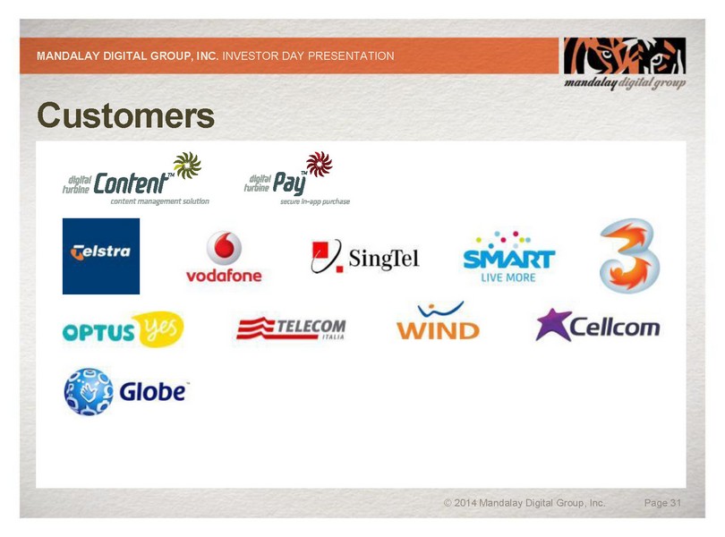 Customers MANDALAY DIGITAL GROUP, INC. INVESTOR DAY PRESENTATION © 2014 Mandalay Digital Group, Inc. Page 31