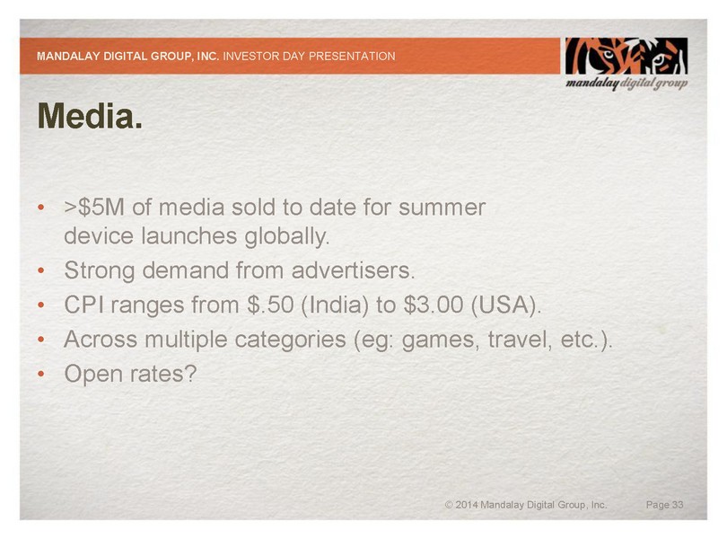 Media. • >$5M of media sold to date for summer device launches globally. • Strong demand from advertisers. • CPI ranges from $.50 (India) to $3.00 (USA ). • Across multiple categories (eg: games, travel, etc. ). • Open rates ? MANDALAY DIGITAL GROUP, INC. INVESTOR DAY PRESENTATION © 2014 Mandalay Digital Group, Inc. Page 33