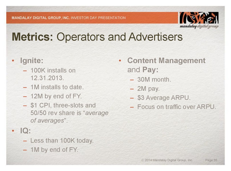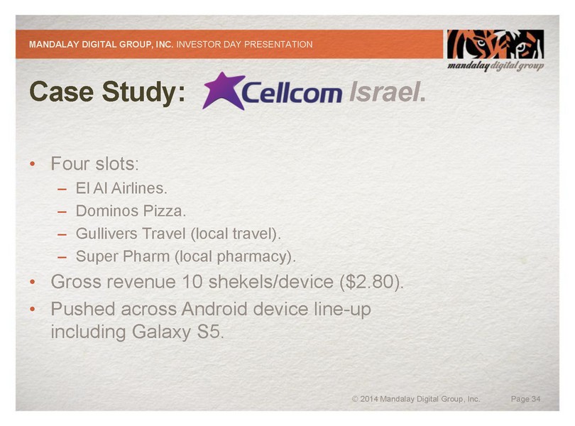 Case Study: Israel . • Four slots: – El Al Airlines. – Dominos Pizza. – Gullivers Travel (local travel ). – Super Pharm (local pharmacy ). • Gross revenue 10 shekels/device ($2.80 ). • Pushed across Android device line - u p including Galaxy S5. MANDALAY DIGITAL GROUP, INC. INVESTOR DAY PRESENTATION © 2014 Mandalay Digital Group, Inc. Page 34