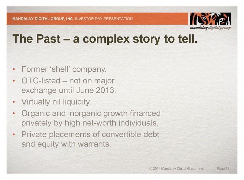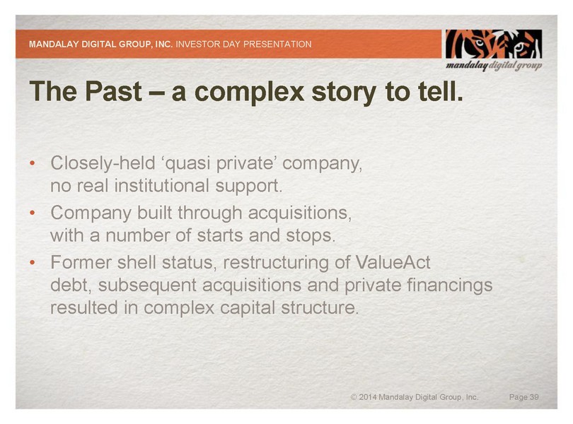 The Past – a complex story to tell. • Former ‘shell’ c ompany. • OTC - listed – not on major exchange until June 2013. • Virtually nil liquidity. • Organic and inorganic growth financed privately by high net - worth individuals. • Private placements of convertible debt and equity with warrants. MANDALAY DIGITAL GROUP, INC. INVESTOR DAY PRESENTATION © 2014 Mandalay Digital Group, Inc. Page 38