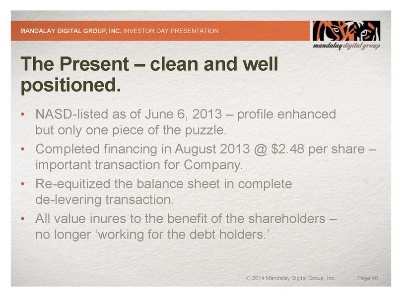 The Past – a complex story to tell. • Closely - held ‘quasi private’ company , no real institutional support. • Company built through acquisitions, with a number of starts and stops. • Former shell status, restructuring of ValueAct debt , subsequent acquisitions and private financings resulted in complex capital structure. MANDALAY DIGITAL GROUP, INC. INVESTOR DAY PRESENTATION © 2014 Mandalay Digital Group, Inc. Page 39