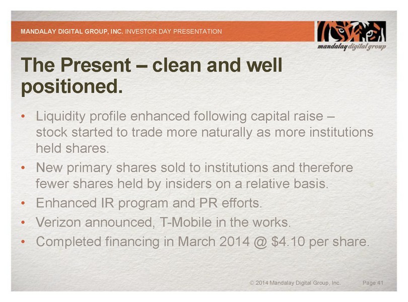 The Present – clean and well positioned. • NASD - listed as of June 6, 2013 – profile enhanced but only one piece of the puzzle. • Completed financing in August 2013 @ $2.48 per share – important transaction for Company. • Re - equitized the balance sheet in complete de - levering transaction. • All value inures to the benefit of the shareholders – no longer ‘working for the debt holders.’ MANDALAY DIGITAL GROUP, INC. INVESTOR DAY PRESENTATION © 2014 Mandalay Digital Group, Inc. Page 40