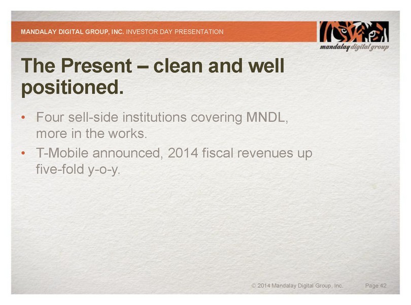 The Present – clean and well positioned. • Liquidity profile enhanced following capital raise – stock started to trade more naturally as more institutions held shares. • New primary shares sold to institutions and therefore fewer shares held by insiders on a relative basis. • Enhanced IR program and PR efforts. • Verizon announced, T - Mobile in the works. • Completed financing in March 2014 @ $4.10 per share. MANDALAY DIGITAL GROUP, INC. INVESTOR DAY PRESENTATION © 2014 Mandalay Digital Group, Inc. Page 41