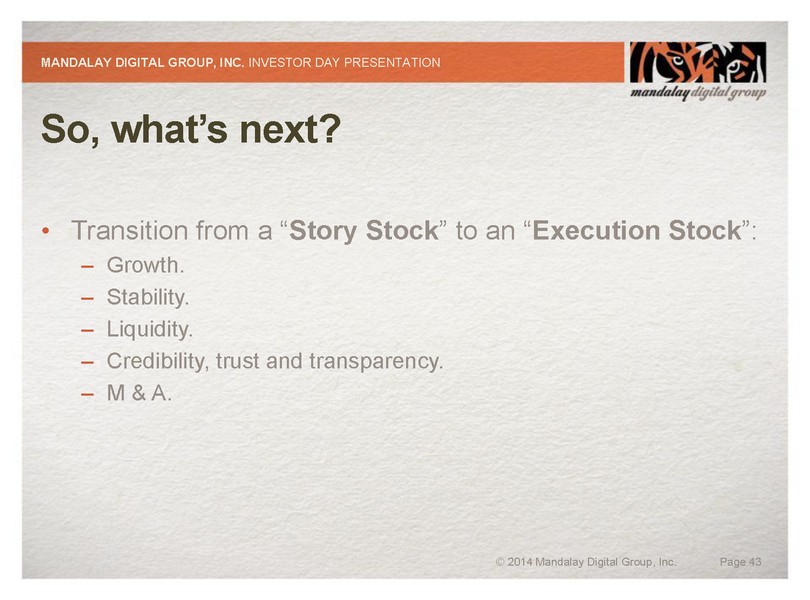 So, what’s next? • Transition from a “ Story Stock ” to an “ Execution Stock ”: – Growth. – Stability. – Liquidity. – Credibility, trust and transparency. – M & A. MANDALAY DIGITAL GROUP, INC. INVESTOR DAY PRESENTATION © 2014 Mandalay Digital Group, Inc. Page 43