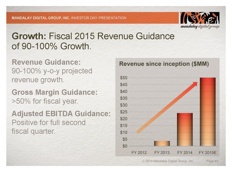 Growth: Fiscal 2015 Revenue Guidance of 90 - 100% Growth. Revenue Guidance: 90 - 100% y - o - y projected revenue growth. Gross Margin Guidance: > 50% for fiscal year. Adjusted EBITDA Guidance: Positive for full second fiscal quarter. MANDALAY DIGITAL GROUP, INC. INVESTOR DAY PRESENTATION © 2014 Mandalay Digital Group, Inc. Page 44