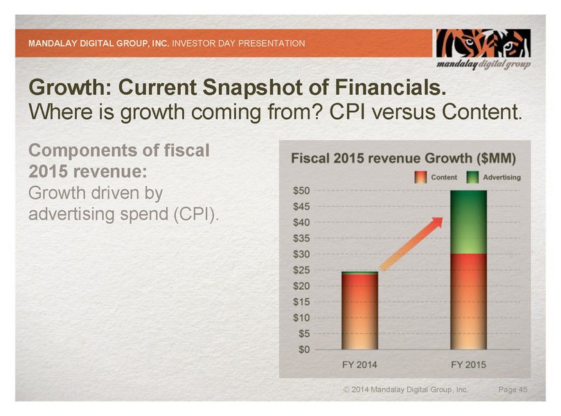 Growth: Current Snapshot of Financials . Where is growth coming from? CPI versus Content. Components of fiscal 2015 revenue: Growth driven by advertising spend (CPI ). MANDALAY DIGITAL GROUP, INC. INVESTOR DAY PRESENTATION © 2014 Mandalay Digital Group, Inc. Page 45