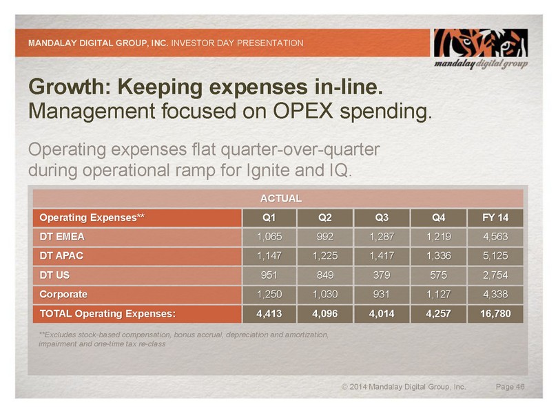 Growth : Keeping expenses in - line . Management focused on OPEX spending. Operating expenses flat quarter - over - quarter during operational ramp for Ignite and IQ. MANDALAY DIGITAL GROUP, INC. INVESTOR DAY PRESENTATION © 2014 Mandalay Digital Group, Inc. Page 46 Operating Expenses** Q1 ACTUAL Q2 Q3 Q4 FY 14 DT EMEA 1,065 992 1,287 1,219 4,563 DT APAC 1,147 1,225 1,417 1,336 5,125 DT US 951 849 379 575 2,754 C orporate 1,250 1,030 931 1,127 4,338 TOTAL Operating Expenses: 4,413 4,096 4,014 4,257 16,780 **Excludes stock - based compensation, bonus accrual, depreciation and amortization, impairment and one - time tax re - class