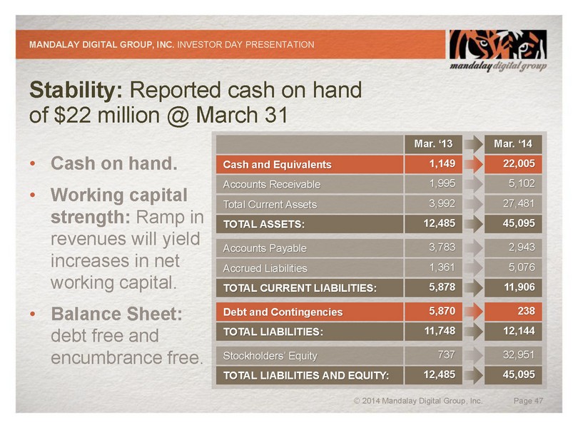 Stability: Reported cash on hand of $22 million @ March 31 MANDALAY DIGITAL GROUP, INC. INVESTOR DAY PRESENTATION © 2014 Mandalay Digital Group, Inc. Page 47 Mar. ‘14 5,102 27,481 45,095 • Cash on hand. • Working capital strength: Ramp in revenues will yield increases in net working capital. • Balance Sheet: debt free and encumbrance free. 22,005 2,943 5,076 11,906 238 12,144 32,951 45,095 Mar. ‘13 1,995 3,992 12,485 1,149 3,783 1,361 5,878 5,870 11,748 737 12,485 Accounts Receivable Total Current Assets TOTAL ASSETS: Cash and Equivalents Accounts Payable Accrued Liabilities TOTAL CURRENT LIABILITIES: Debt and Contingencies TOTAL LIABILITIES: Stockholders’ Equity TOTAL LIABILITIES AND EQUITY: