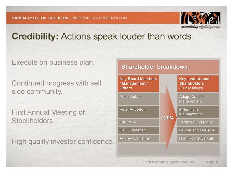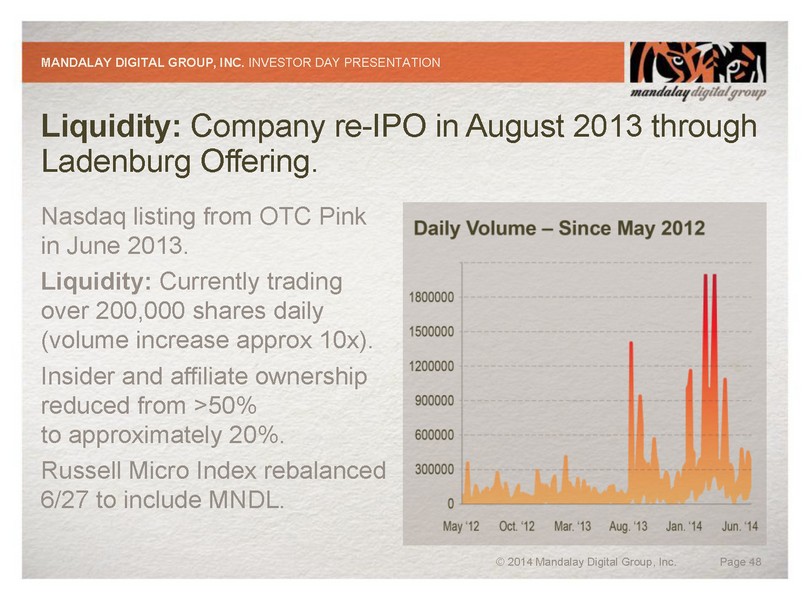 Liquidity: Company re - IPO in August 2013 through Ladenburg Offering. Nasdaq listing from OTC Pink in June 2013. Liquidity: Currently trading over 200,000 shares daily (volume increase approx 10x ) . Insider and affiliate ownership reduced from >50% to approximately 20 %. Russell Micro Index rebalanced 6/27 to include MNDL. MANDALAY DIGITAL GROUP, INC. INVESTOR DAY PRESENTATION © 2014 Mandalay Digital Group, Inc. Page 48