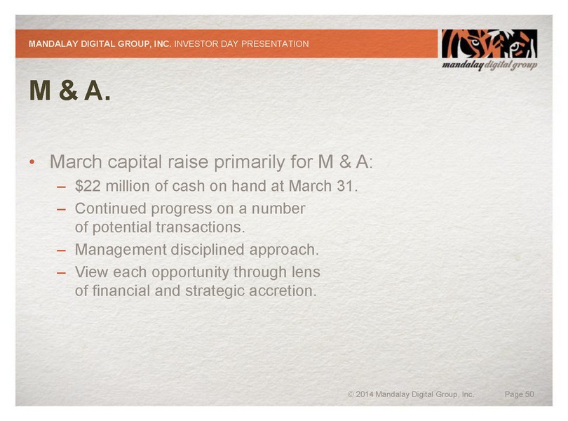 M & A. • March capital raise primarily for M & A: – $22 million of cash on hand at March 31. – Continued progress on a number of potential transactions. – Management disciplined approach. – View each opportunity through lens of financial and strategic accretion. MANDALAY DIGITAL GROUP, INC. INVESTOR DAY PRESENTATION © 2014 Mandalay Digital Group, Inc. Page 50