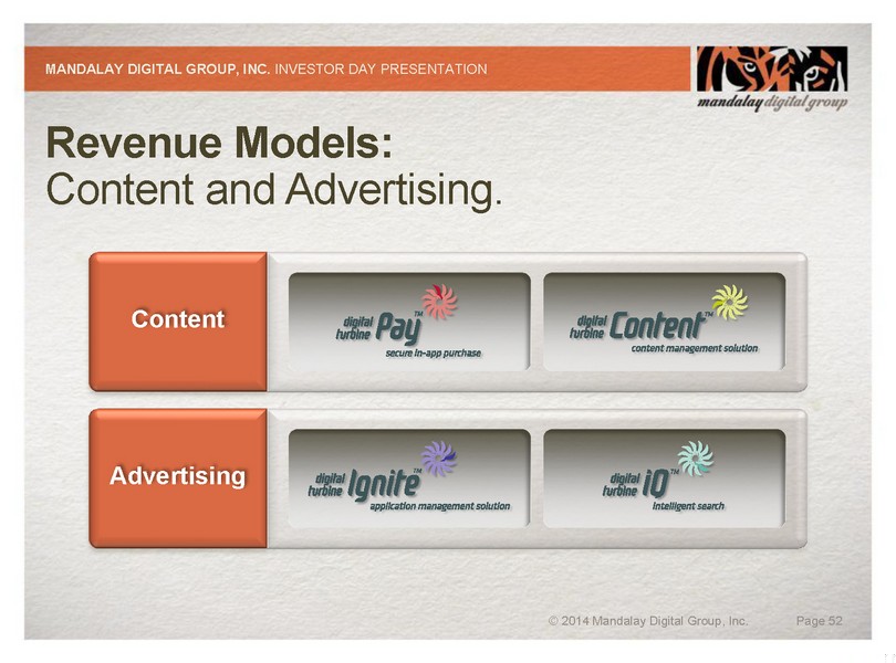 Revenue Models: Content and Advertising. Content MANDALAY DIGITAL GROUP, INC. INVESTOR DAY PRESENTATION Advertising © 2014 Mandalay Digital Group, Inc. Page 52