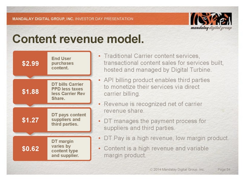 Growth: Current Snapshot of Financials . Where is growth coming from? CPI versus Content. Components of fiscal 2015 revenue: Growth driven by advertising spend (CPI ). MANDALAY DIGITAL GROUP, INC. INVESTOR DAY PRESENTATION © 2014 Mandalay Digital Group, Inc. Page 53