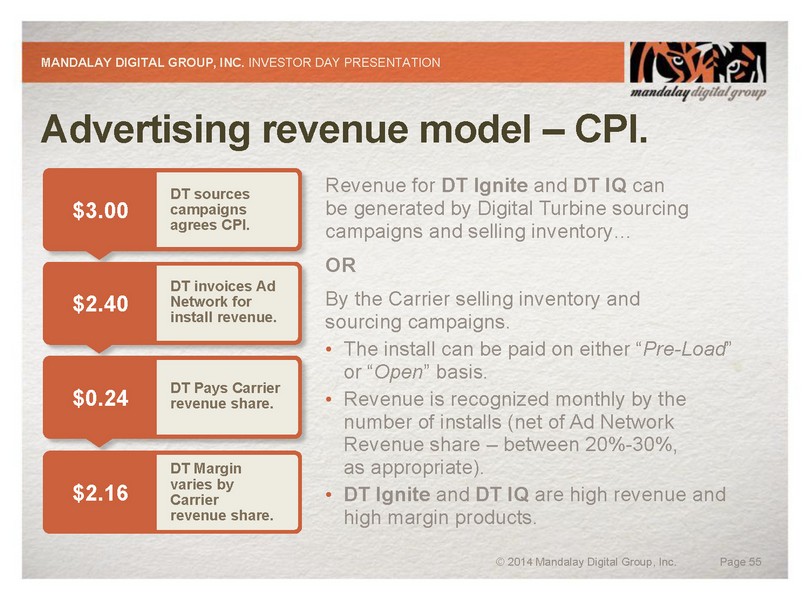 Content revenue model. End User purchases content. • Traditional Carrier content services, transactional content sales for services built, hosted and managed by Digital Turbine. • API billing product enables third parties to monetize their services via direct carrier billing. • Revenue is recognized net of carrier revenue share. • DT manages the payment process for suppliers and third parties. • DT Pay is a high revenue, low margin product. • Content is a high revenue and variable margin product. MANDALAY DIGITAL GROUP, INC. INVESTOR DAY PRESENTATION © 2014 Mandalay Digital Group, Inc. Page 54 $2.99 $1.88 DT bills Carrier PPD less t axes less C arrier R ev Share. $1.27 DT pays content suppliers and third parties. $0.62 DT margin varies by content type and supplier.