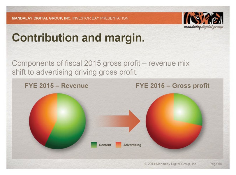 Contribution and margin. Components of fiscal 2015 gross profit – revenue mix shift to advertising driving gross profit. MANDALAY DIGITAL GROUP, INC. INVESTOR DAY PRESENTATION © 2014 Mandalay Digital Group, Inc. Page 56 FYE 2015 – Revenue FYE 2015 – Gross profit
