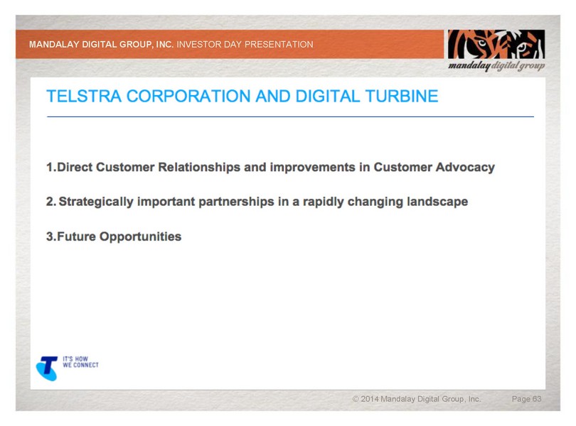 MANDALAY DIGITAL GROUP, INC. INVESTOR DAY PRESENTATION © 2014 Mandalay Digital Group, Inc. Page 63