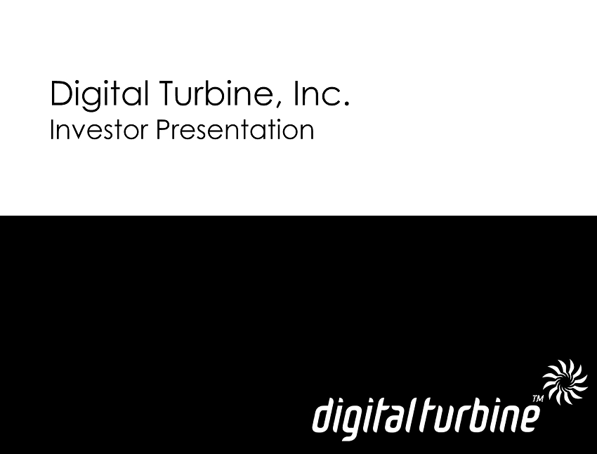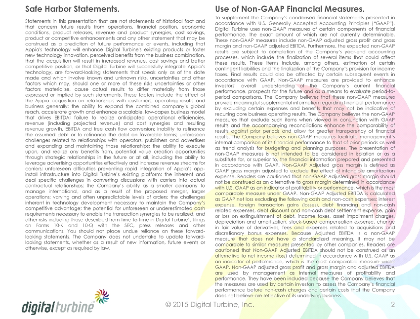Safe Harbor Statements. Statements in this presentation that are not statements of historical fact and that concern future results from operations, financial position, economic conditions, product releases, revenue and product synergies, cost savings, product or competitive enhancements and any other statement that may be construed as a prediction of future performance or events, including that Appia's technology will enhance Digital Turbine's existing products or foster new technology innovation, perceived benefits from the business combination, that the acquisition will result in increased revenue, cost savings and better competitive position, or that Digital Turbine will successfully integrate Appia’s technology, are forward - looking statements that speak only as of the date made and which involve known and unknown risks, uncertainties and other factors which may, should one or more of these risks uncertainties or other factors materialize, cause actual results to differ materially from those expressed or implied by such statements . These factors include the effect of the Appia acquisition on relationships with customers, operating results and business generally ; the ability to expand the combined company’s global reach, accelerate growth and enhance a scalable, low - capex business model that drives EBITDA ; failure to realize anticipated operational efficiencies, revenue (including projected revenue) and cost synergies and resulting revenue growth, EBITDA and free cash flow conversion ; inability to refinance the assumed debt or to refinance the debt on favorable terms ; unforeseen challenges related to relationships with operators, publishers and advertisers and expanding and maintaining those relationships ; the ability to execute upon, and realize any benefits from, potential value creation opportunities through strategic relationships in the future or at all, including the ability to leverage advertising opportunities effectively and increase revenue streams for carriers ; unforeseen difficulties preventing rapid integration of Appia’s app - install infrastructure into Digital Turbine’s existing platform ; the inherent and deal specific challenges in converting discussions with carriers into actual contractual relationships ; the Company’s ability as a smaller company to manage international, and as a result of the proposed merger, larger operations ; varying and often unpredictable levels of orders ; the challenges inherent in technology development necessary to maintain the Company’s competitive advantage ; the potential for unforeseen or underestimated cash requirements necessary to enable the transaction synergies to be realized, and other risks including those described from time to time in Digital Turbine’s filings on Forms 10 - K and 10 - Q with the SEC, press releases and other communications . You should not place undue reliance on these forward - looking statements . The Company does not undertake to update forward - looking statements, whether as a result of new information, future events or otherwise, except as required by law . Use of Non - GAAP Financial Measures . To supplement the Company’s condensed financial statements presented in accordance with U . S . Generally Accepted Accounting Principles (“ GAAP ”), Digital Turbine uses non - GAAP measures of certain components of financial performance, the exact amount of which are not currently determinable . These non - GAAP measures include non - GAAP adjusted gross profit and gross margin and non - GAAP adjusted EBITDA . Furthermore, the expected non - GAAP results are subject to completion of the Company’s year - end accounting processes, which include the finalization of several items that could affect these results . These items include, among others, estimation of certain contingent liabilities and the finalization of the Company’s provision for income taxes . Final results could also be affected by certain subsequent events in accordance with GAAP . Non - GAAP measures are provided to enhance investors’ overall understanding of the Company’s current financial performance, prospects for the future and as a means to evaluate period - to - period comparisons . The Company believes that these non - GAAP measures provide meaningful supplemental information regarding financial performance by excluding certain expenses and benefits that may not be indicative of recurring core business operating results . The Company believes the non - GAAP measures that exclude such items when viewed in conjunction with GAAP results and the accompanying reconciliations enhance the comparability of results against prior periods and allow for greater transparency of financial results . The Company believes non - GAAP measures facilitate management’s internal comparison of its financial performance to that of prior periods as well as trend analysis for budgeting and planning purposes . The presentation of non - GAAP measures is not intended to be considered in isolation or as a substitute for, or superior to, the financial information prepared and presented in accordance with GAAP . Non - GAAP Adjusted gross margin is defined as GAAP gross margin adjusted to exclude the effect of intangible amortization expense . Readers are cautioned that non - GAAP Adjusted gross margin should not be construed as an alternative to gross margin determined in accordance with U . S . GAAP as an indicator of profitability or performance, which is the most comparable measure under GAAP . Non - GAAP Adjusted EBITDA is calculated as GAAP net loss excluding the following cash and non - cash expenses : interest expense, foreign transaction gains (losses), debt financing and non - cash related expenses, debt discount and non - cash debt settlement expense, gain or loss on extinguishment of debt, income taxes, asset impairment charges, depreciation and amortization, stock - based compensation expense, change in fair value of deri