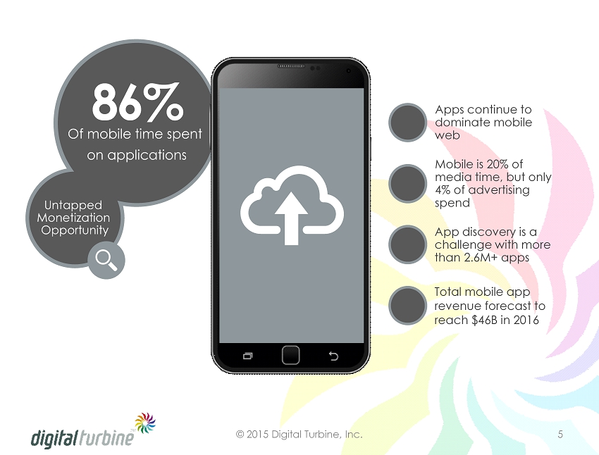 Smartphones & apps are the technology platform of our time 1.4Bn +2Bn 1.3M smartphones shipped in 2014 smartphones predicted to ship in 2015 apps on both Google Play and the App Store +100k new apps each month Smartphone shipments are predicted to exceed more than 2 billion devices in 2015, while application development across Google Play and iOS soars © 2015 Digital Turbine, Inc. 4