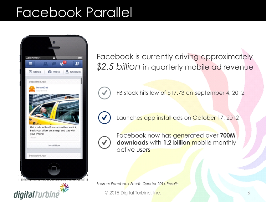 Facebook is currently driving approximately $2.5 billion in quarterly mobile ad revenue FB stock hits low of $17.73 on September 4, 2012 Launches app install ads on October 17, 2012 Facebook now has generated over 700M downloads with 1.2 billion mobile monthly active users Facebook Parallel Source: Facebook Fourth Quarter 2014 Results © 2015 Digital Turbine, Inc. 6