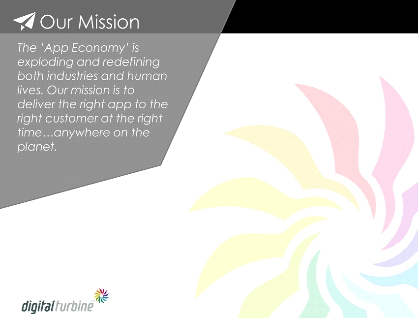 Our Mission The ‘App Economy’ is exploding and redefining both industries and human lives. Our mission is to deliver the right app to the right customer at the right time…anywhere on the planet.