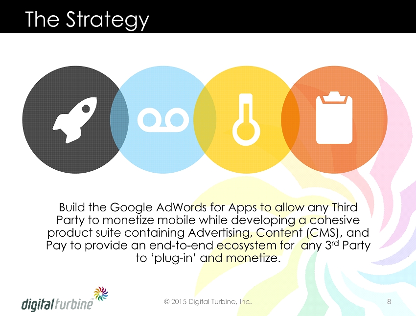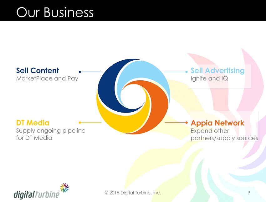 Build the Google AdWords for Apps to allow any Third Party to monetize mobile while developing a cohesive product suite containing Advertising, Content (CMS), and Pay to provide an end - to - end ecosystem for any 3 rd Party to ‘plug - in’ and monetize. The Strategy © 2015 Digital Turbine, Inc. 8