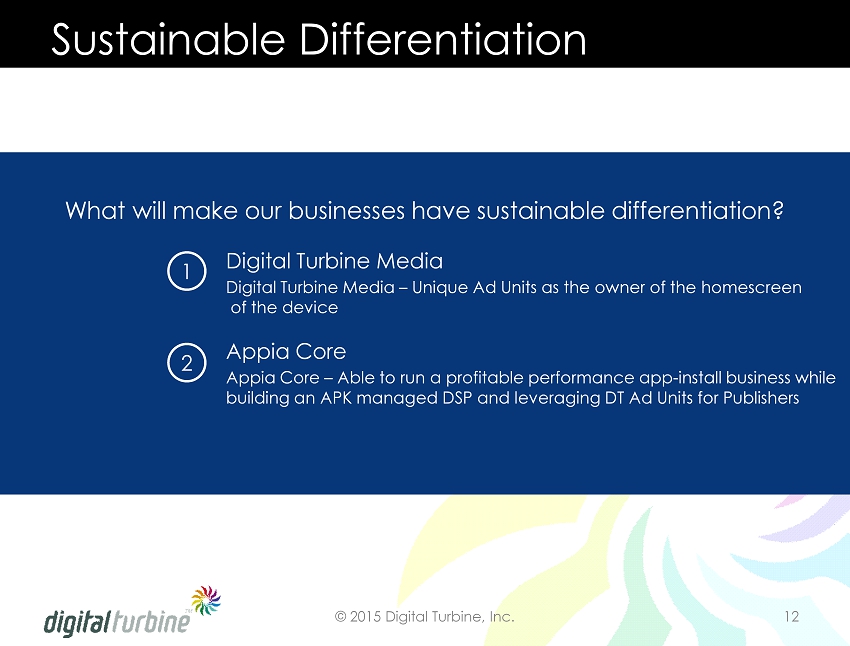 Digital Turbine Media will focus as an advertiser solution for unique and exclusive carrier inventory. The primary products will be DT Ignite & DT IQ. Digital Turbine Media Appia , will continue to scale as a leading worldwide mobile user acquisition network, focused on multiple demand and supply solutions that have sustainability in the market. Appia Core Defining Appia Core vs. DT Media © 2015 Digital Turbine, Inc. 11